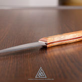 Dieses Kneipchen besteht aus einem japanischen Lagenstahl der Firma "Takefu" hergestellt, dieser hat eine Schneidlage aus VG10 und ist beidseitig mit 33 Lagen Edelstahl, sowie einer Verbindungslage verschweißt. Die Außenlagen sorgen für das Muster, welches sich nach dem Ätzen zeigt und sorgen für eine hohe Stabilität der Klinge, da nur die Mittellage gehärtet wird und die Außenlagen elastisch bleiben.