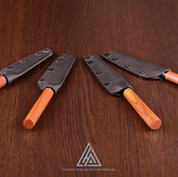 Diese 4 Kneipchen sind aus einem japanischen Lagenstahl der Firma "Takefu" hergestellt, dieser hat eine Schneidlage aus VG10 und ist beidseitig mit 33 Lagen Edelstahl, sowie einer Verbindungslage verschweißt. Die Außenlagen sorgen für das Muster, welches sich nach dem Ätzen zeigt und sorgen für eine hohe Stabilität der Klinge, da nur die Mittellage gehärtet wird und die Außenlagen elastisch bleiben.