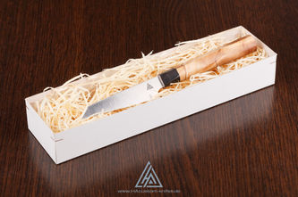 Um das Messer vor Beschädigungen zu schützen, besitzt es eine Ledergefütterte Scheide aus Esche mit einem Sicherungsstift aus Messing und Ebenholz