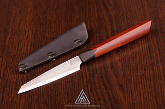 Die extreme Schärfe erhält das Messer mit Hilfe eines von mir konzipierten Winkelgeführten Schleifsystems. Genutzt werden japanische Wassersteinen (bis zu einer 12000er Körnung) mit abschließendem polieren auf einem Abziehleder.