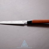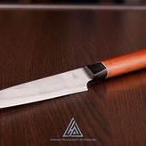Dieses Allzweckmesser ist aus einem japanischen Lagenstahl der Firma "Takefu" hergestellt, dieser hat eine Schneidlage aus VG10 und ist beidseitig mit 33 Lagen Edelstahl, sowie einer Verbindungslage verschweißt. Die Außenlagen sorgen für das Muster, welches sich nach dem Ätzen zeigt und sorgen für eine hohe Stabilität der Klinge, da nur die Mittellage gehärtet wird und die Außenlagen elastisch bleiben.