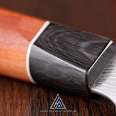 Um das Messer vor Beschädigungen zu schützen, besitzt es eine Ledergefütterte Scheide aus Pflaumenholz mit einem Sicherungsstift aus Chromstahl.